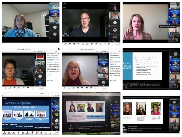 北京时间8月21日、23日晚上19:00-22:00,会议先后安排了9场前置研修坊和后置研修坊。桑新民和谢阳斌、Spencer Benson、丁妍、李赛强和杨鲜梅、范怡红及其团队成员、汪琼、庞海芍和王青、高琪、孙建荣等十多位专家带来了9场专题研修坊。主题包括:教学学术视野中的团队教学创新;Integrating SoTL into Your Teaching: How Teaching is Research;在课堂教学中探索研究问题;高校教师教学学术活动的实践策略;基于多维学术观、全人教育、项目式教学的课程或跨学科课程设计;以学生为中心的混合教学设计;教师如何做教学研究;教与学学术(SoTL)和教师发展(FD);如何测评课程思政教学结果—基于专业认证理念的测评设计等。主讲人和参与者在云端借助多种网络工具展开了热烈交流和深度学习,使参与者收获满满,高度称赞,三个多小时的研修坊仍觉意犹未尽。