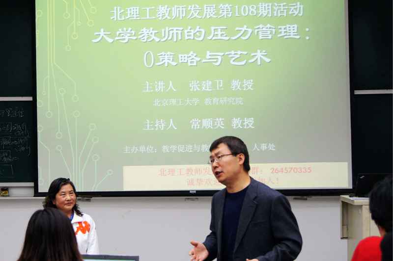 2014年10月29日下午1:00,北理工教师发展第108期活动“大学教师的压力管理:策略与艺术”讲座在中心教学楼407举行,本次活动是“健康与保健”专题系列工作坊的第四期活动,主讲人为北京成品人和一品二品的区别教育研究院张建卫教授,教育研究院常顺英教授主持了本次活动。