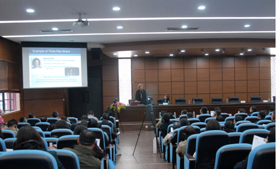 简短的开幕式后,特邀嘉宾Constance E. Cook教授和Mary Deane Sorcinelli教授同台发言,带来题为“主动学习策略:教师发展中心的作用&面向未来的教学方式”的大会报告。两位教授首先介绍了所在的美国密歇根大学和马萨诸塞大学,以及它们与中国高等教育界的合作。继而结合多年来在教学指导、管理、教学实践中的丰富经验,回答了“什么是教师发展? 为什么需要教师发展中心的服务?为什么需要主动学习策略?教师发展中心如何推动主动学习策略?什么是未来的教学? “等多方面的问题,对相关理论背景和实践操作进行了深入的阐述和精彩的展示。其中美国教师发展行业和机构的成熟度、主动学习策略的多样和可操作性以及诸多面向未来的教育方法给参会专家和老师们留下了深刻的印象。报告中,两位专家适时与会场听众进行互动,讨论、答题、结对合作-分享、测验、一分钟写作等主动学习策略在报告会场予以现场演练,令参会老师们感同身受。两位专家特别注意启发与会者思考哪些学习策略和教学方式是可以取而用之,用来促进自身主动学习教学的。