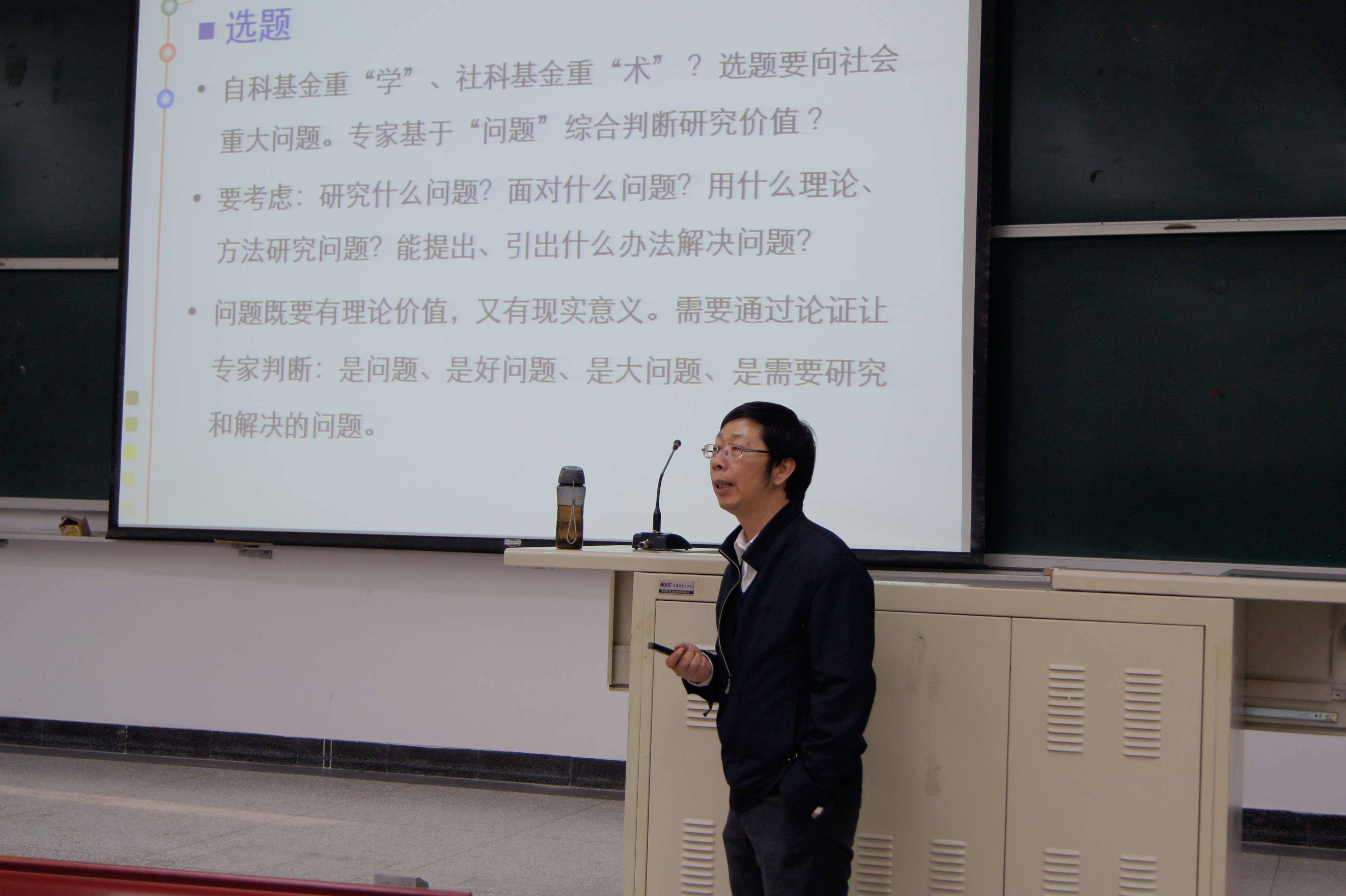 翟教授首先向参会教师展示了自己社科基金获批的项目申请书,将国家社科基金申报中需要注意的事项以及策略娓娓道来。首先是选题问题,翟教授指出,“自然基金重‘学’,社科基金重‘术’,强调选题要把握国家和社会重大问题。”对此,翟教授建议老师们要学习十八大以来重要文件,了解社会发展、国家政策导向的重大问题,同时还要关注互联网、媒体、社会热点话题等,将选题与社会关注的重要问题紧密结合起来,并要深入分析往年立项题目,以获得灵感。